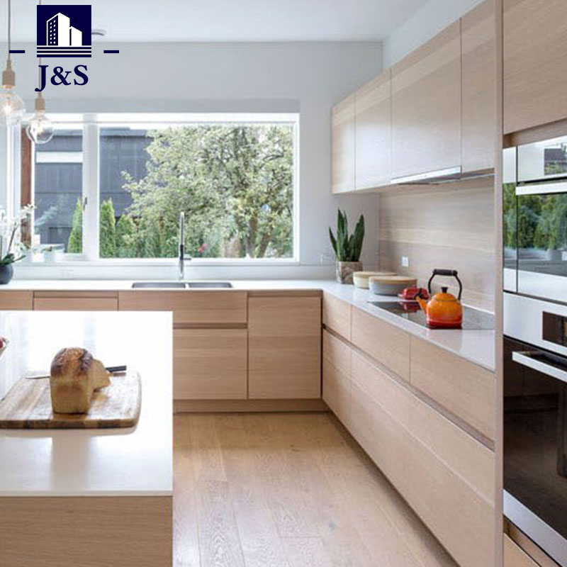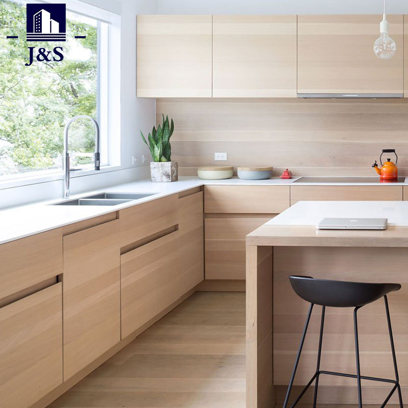 Budget melamin köksskåp refacing är ett modernt melamin kök med en typisk L-formad layout. Träfibrerna melamin är inte bara ekonomiskt utan också moderiktigt. Samtidigt ger högskåpen och väggskåpen pentryt gott om förvaringsutrymme.