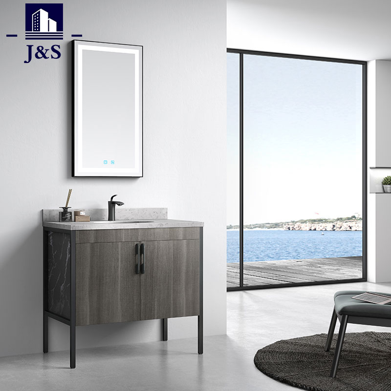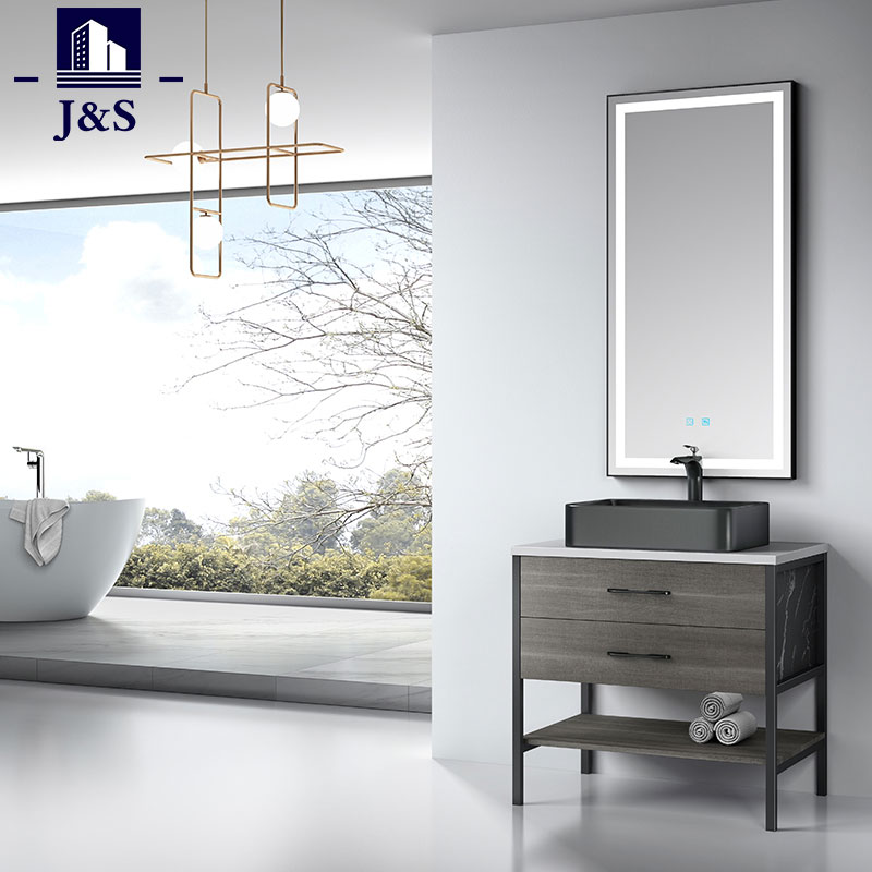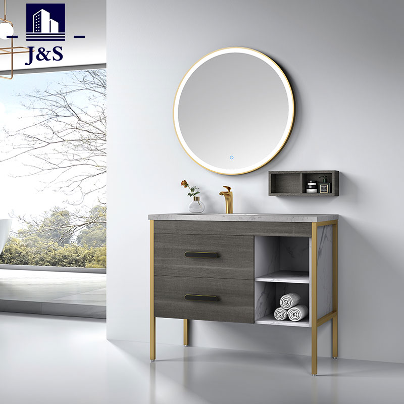 J&S levererar ett modernt rustikt badrumsskåp Sets Corner.Designen på denna badrumssmärta i kombination med aluminiumram, plywood skåpkropp, tandemlåda med lådor, kvartsskiva kommer att vara det slitstarka och starkare materialet för fåfänga. Spegelhängande möta kundernas behov.