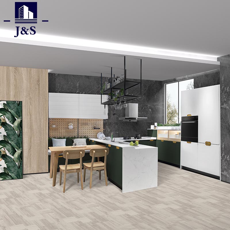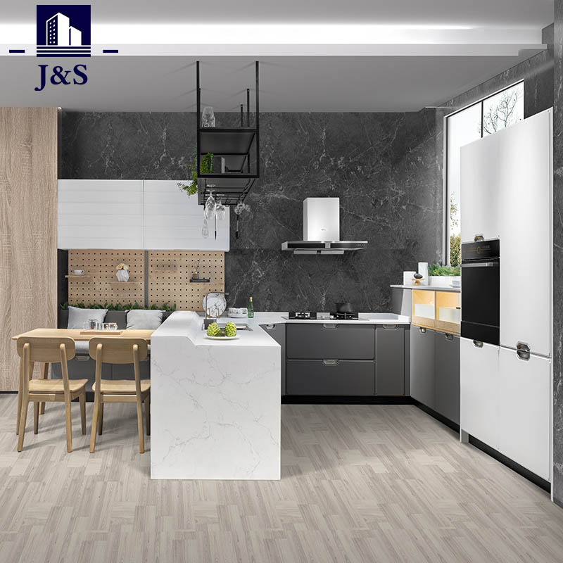 J&S leverans Ny design matt vit köksskåp, det är akrylbehandlat dörrköksskåp. Akryldörrpaneler används för god transparens, eftersom denna typ av dörrpaneler är gjorda av färglösa och transparenta plexiglasplattor och dess ljusgenomsläpplighet kan nå mer än 92 %, uppnå en spegeleffekt och visuellt utöka köksutrymmet.