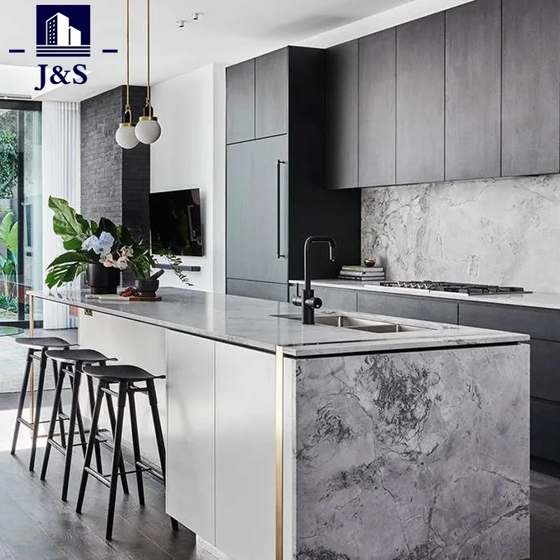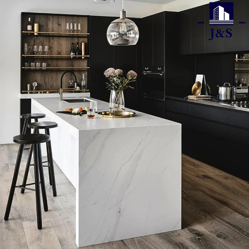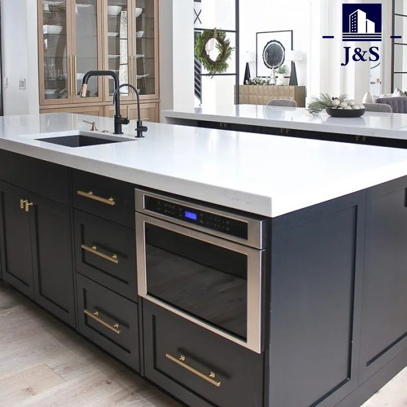 Stock High end köksskåp bänkskiva är kvarts sten bänkskiva som är en ny teknik konstgjord sten syntetiserad av fin kvarts. Den har olika färger och har en naturstens struktur och lyster. Kvartssten är en icke-radioaktiv förorening, återanvändbart, miljövänligt och grönt inredningsmaterial för nybyggnad, så det används ofta i köksbänkskivor, tvättställ, köks- och badrumsväggar, matbord, soffbord, fönsterbrädor, dörrkåpor och andra fält.